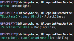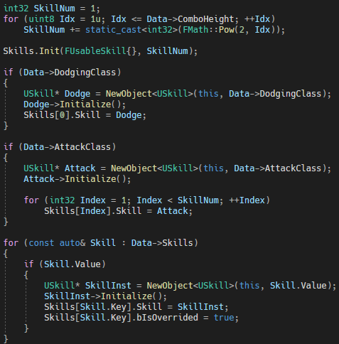무기를 교체해도 콤보 진행은 유지되기에 Binary Tree는 Weapon에, Iterator는 Weapon Component에 존재한다. 우선 Weapon에 있는 Skill Class의 설정 코드를 보면, 우선 Data Table에 있는 Combo Height 변수를 사용해 Binary Tree를 표현할 배열의 크기를 설정한다. 그 후 루트 노드는 사용하지 않기에 메모리를 절약하기 위해 Dodge Skill을 설정하였다. 나머지 노드는 전부 Attack Class로 설정한 뒤, Override 된 노드가 있을 경우 덮어쓰는 작업을 통해 Skill Class를 초기화한다.