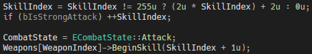 우선 Dodge Skill이 요청될 경우, 바로 0번째 스킬을 요청하면 된다. Attack Skill이 요청될 경우 우선 현재 Index가 255인지 확인한다. Index가 255라는 뜻은 콤보를 실행 중에 있지 않다는 뜻이다. Index가 255일 경우 0으로 설정하고, 아니라면 수식 ((2 * Skill Index) + 2)을 통해 다음 Index를 계산한다. 마지막으로 강 공격이 요청되었을 경우, Index를 1 올리면 실행해야 할 Skill의 Index가 구해진다. 당연히 Dodge가 0번이기에 Index에 1을 더한 값으로 요청해야 한다.