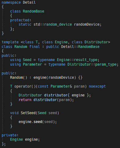 코드와 함께 보도록 하자. 단순히 보면 C++ 11의 random 객체를 wrapping 한 것이긴 하다. T는 난수의 타입, Engine은 랜덤 엔진으로 보통 Mersenne Twister 엔진이다. Distributor는 uniform_int_distribution이나 normal_distribution 등의 난수 분포이다. Seed와 Parameter는 표준 규격에 정의된 타입을 통해 추론한다. 여기서 random_device만 부모 함수로 뺀 이유는 코드 비대화를 막기 위해서이다. (Effective C++ 항목 44 참고) 이를 통해 모든 Random 객체가 하나의 random_device를 사용하게끔 제작하였다.