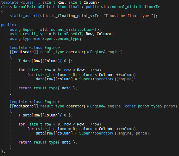 벡터와 행렬의 Distributor는 직접 제작할 필요가 있다. 간단히 난수를 길이만큼 뽑아서 조합하게끔 구현하였다. 다음은 행렬의 정규 분포 난수 Distributor이다. 추후 개발할 Quaternion이나 Rotator 등의 객체 역시 이렇게 간단히 확장 가능하다.