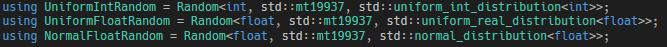 Int와 Float 등의 Distributor는 이미 STL에 정의되어있기에 이를 이용한 Random 객체를 Type화 하면 된다.
