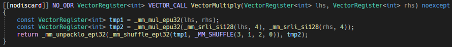 정수 벡터 곱은 SSE4.1부터 지원되기에 SSE2에서는 다른 방법이 필요하다. 그래도 매 64비트마다 32비트 곱을 해주는 명령어가 존재하기에 그것을 이용하여 구현했다. 아래의 코드가 그 코드이다.