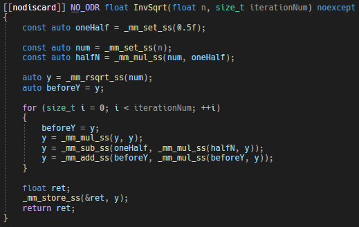 역 제곱근은 rsqrt 명령어가 이미 존재한다. 그러나 이 값은 추측값이기에 더욱 정교한 값을 얻기 위해서는 Newton-Raphson iteration이라는 방법이 필요하다. UE4의 코드를 보니 이를 더욱 정교하게 만든 코드가 있어서 이를 반복문처럼 사용할 수 있게 제작하였다.