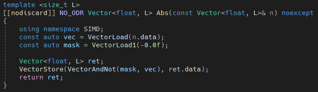 가장 중요한 부분이다. SIMD 명령어를 분리하면 추후 다른 명령어 집합으로 확장해도 Vector, Matrix에는 영향을 주지 않게 된다. 또한 SIMD 명령어의 최적화를 위해서는 Load, Store를 최대한 줄이고 적재되어있는 상태에서 최대한 많은 것을 처리해야 한다. 이를 위해서는 SIMD 명령어를 Vector를 거칠 필요 없이 사용할 수 있어야 한다.