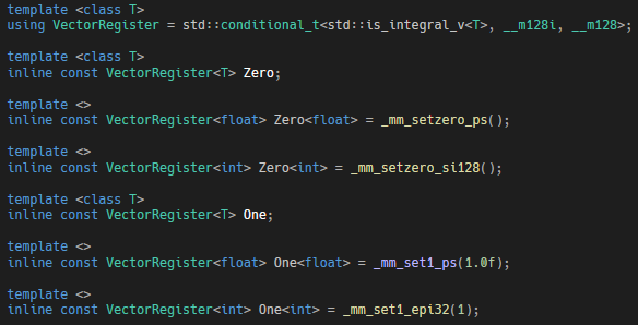 상수는 Template Argument에 따라서 반환될 타입조차 다르다. 그렇기에 Template Specialization을 이용해 구현하였다. 우선 기본이 될 상수는 선언만 해둔 뒤에, 실제 타입이 int면 int에 맞는 상수, float면 float에 맞는 상수를 정의하여 해결할 수 있었다.