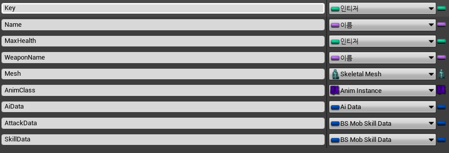 추후 Ai 캐릭터의 확장 등을 고려하면 Anim Instance가 Mob의 종류마다 다를 필요가 있다. 그래서 Mob 설정을 저장하는 Data Table에 AnimClass Property를 추가하였다.