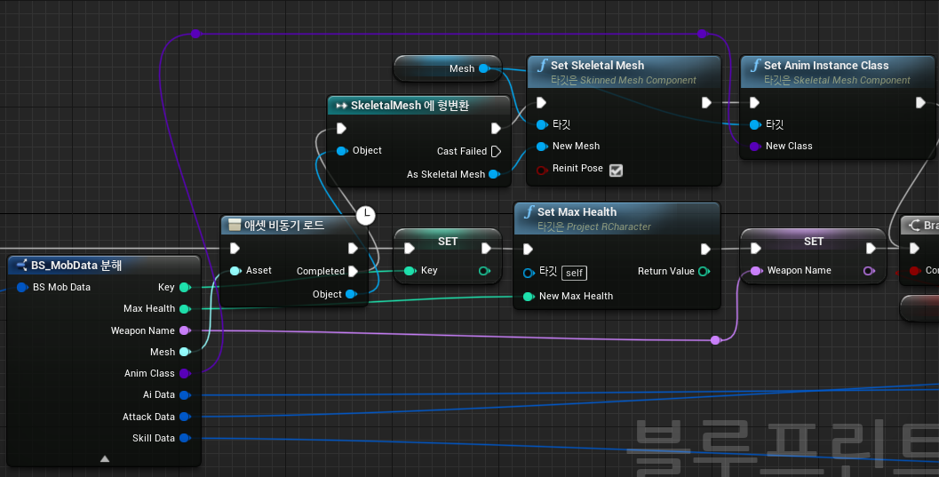 Property의 추가 이후, 이를 적용하는 Blueprint를 작성하고 테스트하는 과정에서 문제가 발생했다. Mob의 Anim Instance는 BeginPlay가 호출되지 않는 것이었다. 이 때문에 필요한 Delegate를 Bind하지 못해서 모든 Character들이 Animation없이 A 포즈로 움직였다.